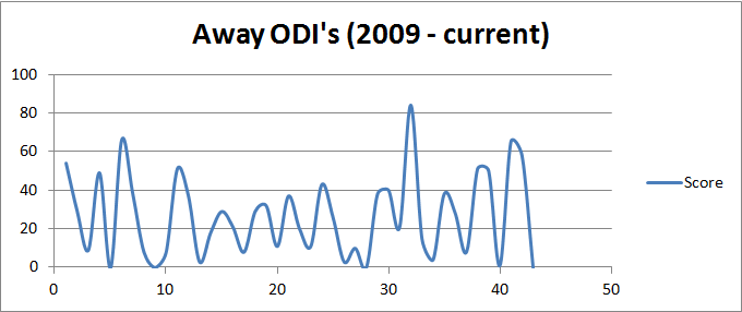 His batting average for the last 46 matches played abroad is 32. The graph has similar troughs. He does well in a couple of games and then gets out cheaply. Thus, he is not a very consistent player on foreign soil.