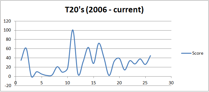 T20’s: Raina has played a total of 32 International T20 matches (28 innings) at an average of 33 and strike rate of 136. Out of the 32 games, he played just 4 in India. The following graph shows a snapshot of the runs scored in all the innings he has played so far. X-axis shows the number of innings played and Y-axis shows the runs scored.