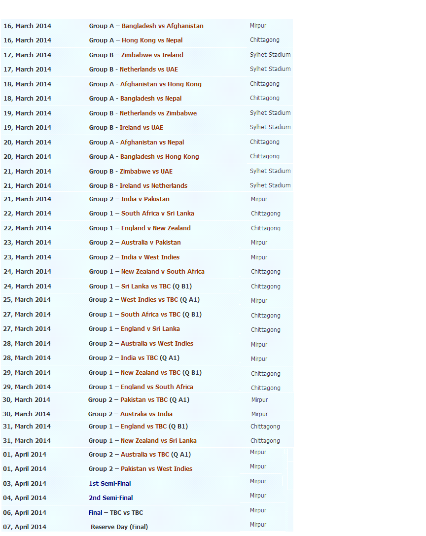 After the recently concluded Asia Cup, there is already a growing buzz about cricket at Bangladesh this season. With a total of 16 teams participating in this edition of the world cup and consisting of new entrants like Nepal and Hong Kong along with a completely new format, the ICC T20 World Cup 2014 is rearing to jump start. Following is the schedule of the tournament: